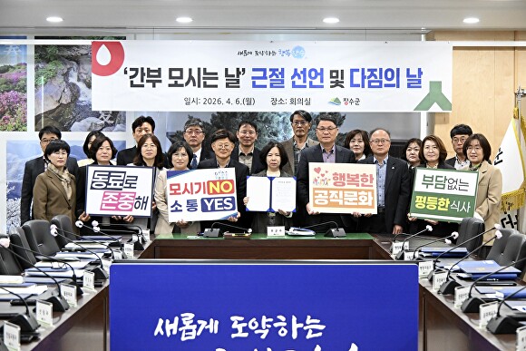 공직사회 잘못된 관행 근절…수평적 조직문화 다짐 장수군은 6일 군청 회의실에서 공직사회 내 불합리한 관행을 개선하고 수평적인 조직문화를 정착시키기 위한 ‘간부 모시는 날’ 근절 선언과 다짐의 날 행사를 개최했다. 이번 행사는 공직사회에 남아 있는 잘못된 관행을 바로잡고, 간부공무원부터 솔선수범하는 조직문화를 확산하기 위해 마련됐다.......