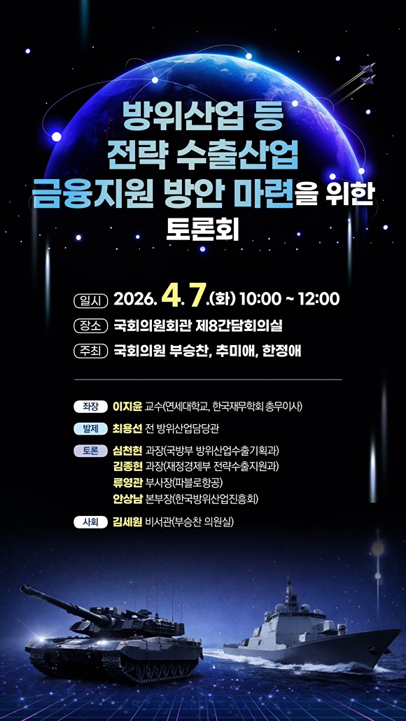 “방위산업 매출 31조 시대”…부승찬 의원, ‘방산수출 진흥기금’ 조성 논의 본격화 입력 2026.04.06 오후 3:26 7일 추미애·한정애 의원과 공동 ‘지속 가능 성장’ 금융지원 방안 토론회 개최 7일 추미애·한정애 의원과 공동 ‘지속 가능 성장’ 금융지원 방안 토론회 개최 부승찬 의원(더불어민주당·용인병)은 7일 국회의원회관 제8간담회의실에서 ‘방위산업 등 전략 수출산업 금융지원 방안 마련을 위한 토론회’를 개최한다고 6일 밝혔다. 이번 토론회는 국회 국방위원회 간사를 맡고 있는 부 의원을 비롯해 관련 법안을 대표 발의한 추미애(더불어민주당·하남갑), 한정애 의원(더불어민주당·서울 강서병)이 공동으로 주최한다....... 기사 전체 보기 https://www.inews24.com/view/1957415 이 포스팅은 쿠팡 파트너스 활동의 일환으로, 이에 따른 일정액의 수수료를 제공받습니다.