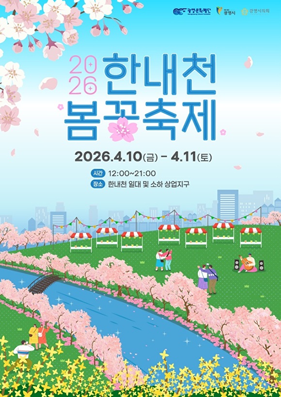 광명문화재단, 10~11일 ‘2026 한내천 봄꽃축제’…포토존·버스킹·피크닉존 등 마련 경기도 광명시 한내천에 봄의 설렘과 여유가 흐르는 축제가 열린다. 광명문화재단은 오는 10일과 11일 한내천과 소하 상업지구 일대에서 ‘2026 한내천 봄꽃축제’를 개최한다고 7일 밝혔다. 한내천 봄꽃축제는 매년 벚꽃과 개나리가 만개하는 시기에 맞춰 열리는 광명의 대표적인 봄 축제다. 특히 인근 상업지구와 협업으로 풍성한 볼거리와 먹거리, 즐길 거리를 제공해 왔다.......