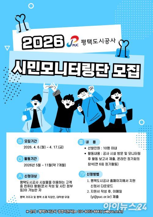 평택도시공사, 시민모니터링단 17일 공개 모집 입력 2026.04.07 오후 1:36 경기도 평택도시공사가 시민과 함께한 소통 강화를 위해 ‘시민모니터링단(8기)’을 공개 모집한다. 7일 공사에 따르면 공사의 다양한 사업과 시설을 알리고, 공공서비스 발전을 위해 이달 17일까지 공개 모집하기로 했다. 시민모니터링단은 공사가 운영하는 △공영주차장 △교통약자지원센터 △진위천유원지 △내리캠핑장 △시립추모공원 △어린이교통공원 △팽성청담스포츠센터 등을 정기·수시로 점검하고, 시설 운영 개선을 위한 의견을 제안하게 된다....... 기사 전체 보기 https://www.inews24.com/view/1957769 이 포스팅은 쿠팡 파트너스 활동의 일환으로, 이에 따른 일정액의 수수료를 제공받습니다.