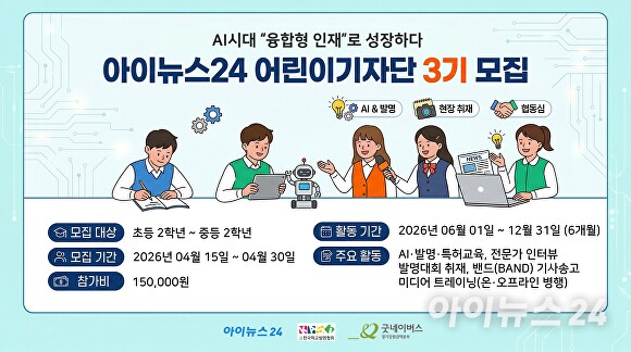 기사 작성 경험이 곧 디지털 포트폴리오로 축적…장학생 선발 등 교육 선순환 입증 아이뉴스24 경기취재본부는 학생들의 실전 취재 경험을 디지털 포트폴리오로 축적하고 장학생 선발까지 연계하는 '어린이기자단 3기'를 운영한다고 8일 밝혔다. 어린이기자단은 학생들의 모든 활동이 단순한 '연습'이 아닌 '실전'으로 이어진다는 점에서 기존 교육 프로그램과 뚜렷한 차별성을 갖는다.......