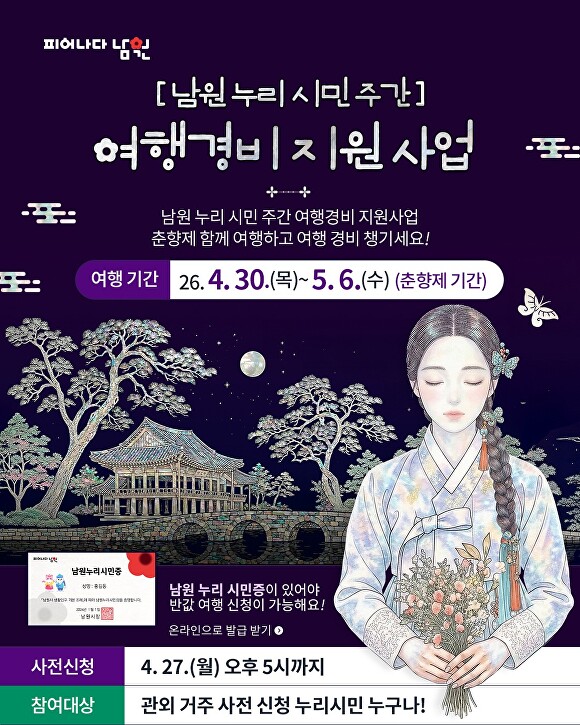 ‘관외 거주’ 누리시민 대상 축제 방문 인증 때 1인당 5만원 한도 지원 전북 남원시가 제96회 춘향제와 연계하여 관외 거주 남원누리시민을 대상으로 여행경비의 절반을 돌려주는 ‘누리시민주간 여행경비 지원사업’을 추진한다. 이번 사업은 ‘남원누리시민’ 20만 명 확보와 지역 내 소비 촉진 및 재방문 유도를 통한 지역경제 활성화를 목표로 기획됐다.......