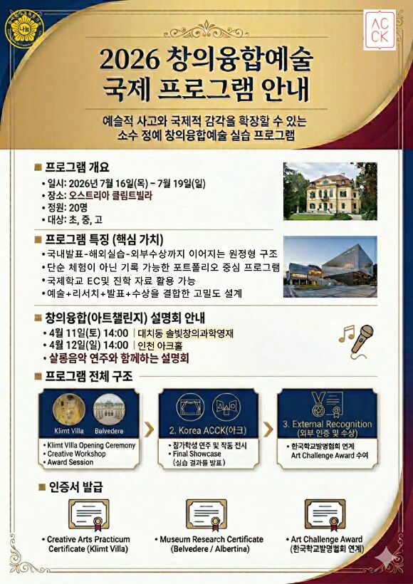 초·중·고 20명 소수 정예 운영···오는 11·12일 대치동·인천서 설명회 개최 예술적 사고와 국제적 감각을 확장하는 ‘2026 창의융합예술 국제 프로그램’이 오는 7월 16일부터 19일까지 오스트리아 클림트 빌라에서 열린다. 이번 프로그램은 예술 실습과 리서치, 발표, 수상을 결합한 고밀도 과정으로 기획됐다. 국제학교 특별활동(EC)이나 진학 자료로 활용 가능한 포트폴리오 중심의 실습을 지원한다.......