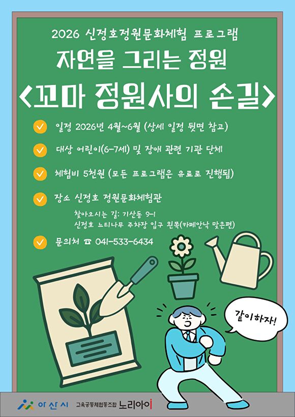 충남 첫 지방정원서 월·화요일 체험 진행…유치원생·장애인 단체 대상 아산시가 충남 첫 지방정원인 신정호정원에서 유아와 장애인 단체를 위한 상반기 정원문화체험 프로그램을 운영한다. 단순 관람을 넘어 정원 속에서 만들고 배우는 체험형 프로그램을 통해 신정호정원의 활용 폭을 넓히겠다는 구상이다. 충남 아산시는 오는 13일부터 6월 23일까지 신정호정원 내 정원문화체험관에서 상반기 정원문화체험 프로그램을 연다고 9일 밝혔다. 프로그램은 모두 20회 진행된다.......