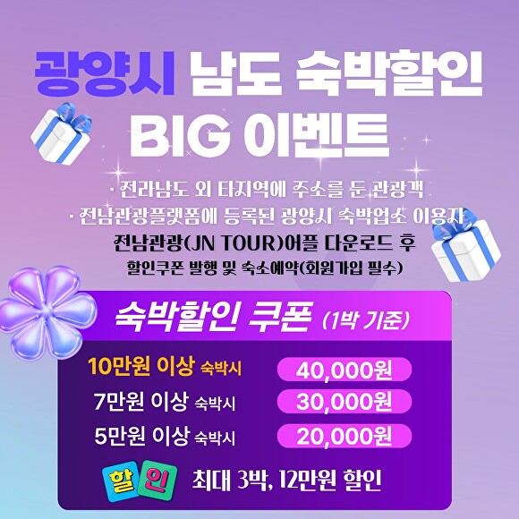 광양시, ‘남도 숙박할인 빅 이벤트' 추진 ... 체류형 관광객 유치 입력 2026.04.09 오후 3:19 최대 12만원 할인·서포터즈 추가 할인 확대 최대 12만원 할인·서포터즈 추가 할인 확대 전남 광양시가 봄철 관광 수요 증가에 맞춰 전라남도와 함께 추진하는 ‘2026 남도 숙박할인 빅(BIG) 이벤트’를 통해 체류형 관광객 유치에 나선다고 9일 밝혔다. 이번 이벤트는 전라남도와 광주광역시를 제외한 지역에 주소를 둔 관광객이 전남 지역 숙박업소를 이용할 경우 할인 혜택을 제공하는 사업으로, 이달부터 11월까지 예산 범위 내에서 운영된다....... 기사 전체 보기 https://www.inews24.com/view/1958728 이 포스팅은 쿠팡 파트너스 활동의 일환으로, 이에 따른 일정액의 수수료를 제공받습니다.
