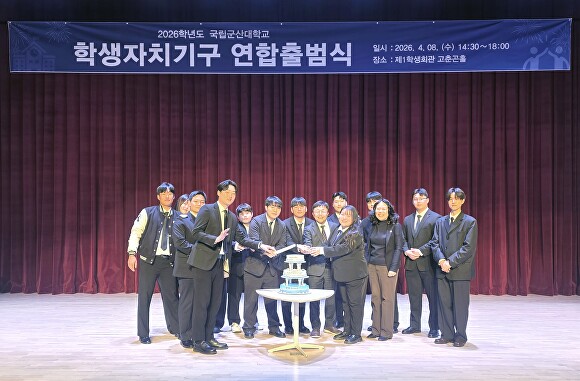 새 학생회 '결(結)', 소통과 연결의 한 해 다짐 국립군산대학교는 지난 8일 교내 제1학생회관 고춘곤홀과 광장에서 ‘2026학년도 학생자치기구 출범식’과 ‘동아리 박람회’를 개최했다. 이날 행사는 국립군산대 공연분과 동아리 팀의 축하 공연, 각 학생자치기구 인사, 총장 축사, 총학생회장 선언문 낭독, 케이크 커팅식 등의 순서로 진행됐다.......