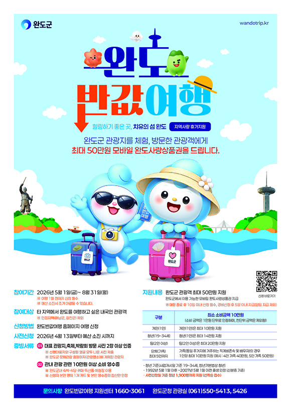 완도서 쓴 돈 절반 돌려받는다... ‘반값 여행’으로 관광객 유치 박차 입력 2026.04.09 오후 5:51 문체부 ‘지역 사랑 휴가 지원’ 시범 사업 선정… 지출액 50% 환급 문체부 ‘지역 사랑 휴가 지원’ 시범 사업 선정… 지출액 50% 환급 전남 완도군이 인구 감소 지역의 새로운 활력을 불어넣기 위해 문화체육관광부와 한국관광공사가 추진하는 ‘지역 사랑 휴가 지원(반값 여행)’ 시범 사업 대상지로 선정되며 본격적인 관광객 맞이에 나선다. 9일 군에 따르면 이번 사업은 관광객이 완도에서 소비한 비용의 절반을 지역 상품권으로 돌려줌으로써 실질적인 관광객 유치와 지역 경제 활성화를 도모하기 위해 기획됐다....... 기사 전체 보기 https://www.inews24.com/view/1958809 이 포스팅은 쿠팡 파트너스 활동의 일환으로, 이에 따른 일정액의 수수료를 제공받습니다.