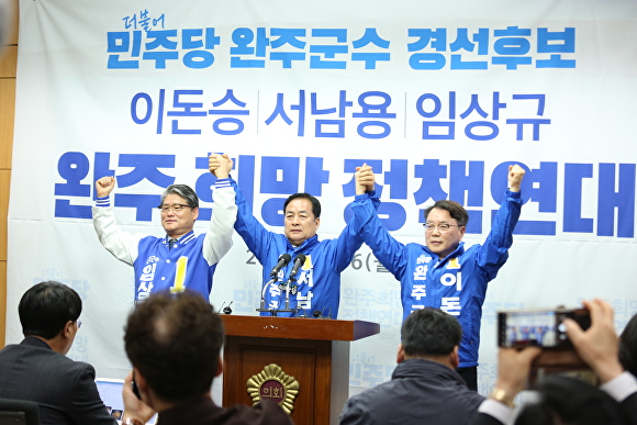 더불어민주당 전북 완주군수 경선 결선에 진출한 이돈승 예비후보가 서남용·임상규 후보에 이어 국영석 전 후보의 지지까지 이끌어냈다. 4명 후보가 현역 단체장에 맞서 ‘반(反) 유희태’를 정점으로 단일화를 전격 성사시켰다. 국영석 전 후보는 16일 SNS을 통해 “서남용·임상규 후보는 ‘정책연대’의 정신을 지키기 위해 개인의 정치적 이익을 과감히 내려놓고, 결선에 진출한 이돈승 후보를 단일후보로 전폭 지지하는 참으로 훌륭한 결단을 내렸다”며 “이돈승·서남용·임상규 세 분의 숭고한 정책연대에 깊은 공감과 지지를 보낸다”고 밝혔다.......