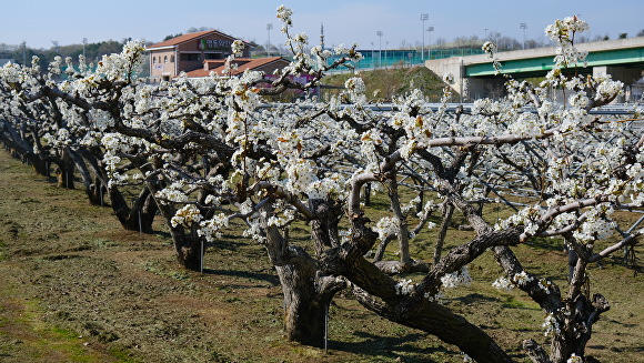 충북 영동군 영동읍 매천리 과일나라테마공원 배꽃이 활짝 펴 상춘객들을 유혹하고 있다. 16일 영동군에 따르면 수령 100년이 넘는 배나무 20그루에 하얀 배꽃이 활짝 펴 장관을 이룬다. 이 배나무들은 110살 안팎으로 추정되며, 신고 품종으로 수고 3~3.5m, 둘레 120~150㎝ 정도다.......