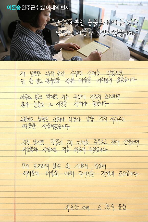 부인 오현숙 씨 "언제나 남을 먼저 세워주는 따뜻한 성품을 지닌 사람" 더불어민주당 전북 완주군수 경선 결선 투표가 오는 20~21일 치러질 예정인 가운데, 이돈승 예비후보의 아내 오현숙 씨가 남편의 28년 외길 정치를 곁에서 지켜본 소회를 담은 손편지를 공개, 주위를 뭉클케 했다. 오현숙 씨는 19일 편지를 통해 남편이 지난 28년 동안 수많은 실패를 겪으면서도 단 한 번도 완주군을 향한 마음을 내려놓지 않았던 끈기와 진정성을 가감 없이 전달했다.......