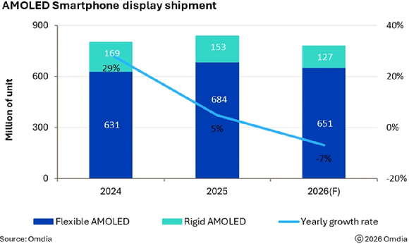 中 화웨이 “원가 상승 부담…가격 인상 가능성” 올해 스마트폰용 디스플레이 출하량이 감소할 것이란 전망이 나왔다. 시장조사업체 옴디아는 20일 보고서를 통해 올해 스마트폰용 능동형유기발광다이오드(AMOLED) 디스플레이 출하량이 7억7800만대로 전년 대비 7% 줄어들 것으로 내다봤다. 능동형유기발광다이오드(AMOLED)는 픽셀 하나하나가 스스로 빛을 내는 방식의 디스플레이로, 액정표시장치(LCD)보다 얇고 전력 효율이 높은 것이 특징이다.......