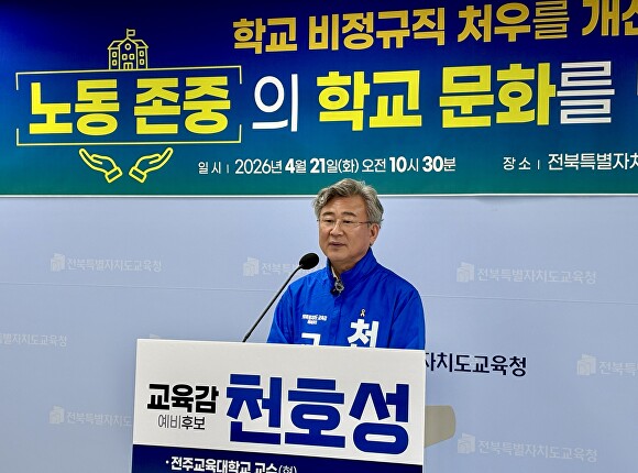노동 존중의 학교문화 조성 약속 천호성 전북교육감 예비후보는 21일 노동 존중의 학교문화를 조성하겠다는 공약을 내놨다. 천 예비후보는 이날 전북교육청 브리핑룸에서 기자회견을 갖고 "전북에는 학교 비정규직 노동자가 무려 42개 직종에 7천여명이나 되고, 방과후교사와 예술강사 등 시간제 강사까지 포함하면 12,000명이 넘는다"며 이들의 처우 개선을 약속했다.......