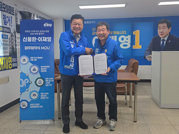 더불어민주당 신용한 충북도지사 예비후보와 이재영 증평군수 예비후보가 증평군 발전을 위해 협력한다. 두 예비후보는 21일 이재영 예비후보 선거사무소에서 증평군 미래 비전 실현을 위한 정책 협약식을 했다. 협약식에는 민주당 소속 충북도의원 후보와 증평군의원 후보, 비례대표 후보 등이 함께 참석해 ‘원팀(One-Team)’으로 지방선거 승리를 다짐했다.......